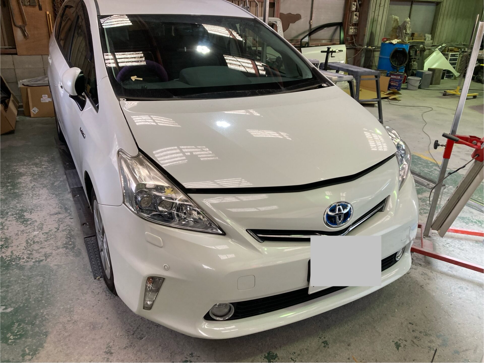 河内長野市在住のお客様よりトヨタ プリウスアルファのフロントガラスヒビ割れ交換のご依頼を頂きました。走行中に飛び石によるヒビ割れです。今回は車両保険にご加入されていたので保険を使用してのガラス交