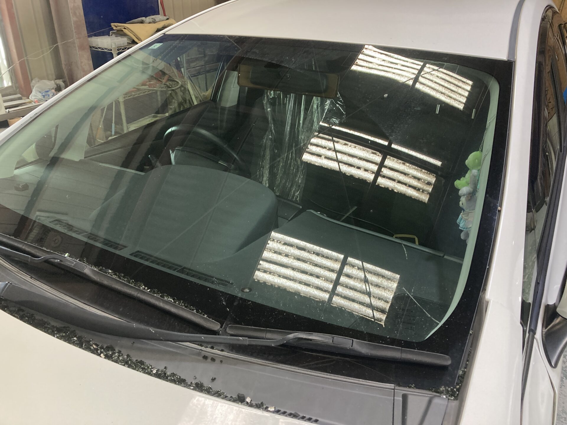 堺市 東区在住のお客様よりホンダフィット、フロントガラス交換のご依頼を頂きました。走行中に飛び石でフロントガラスがヒビ割れしてしまったとの事です。